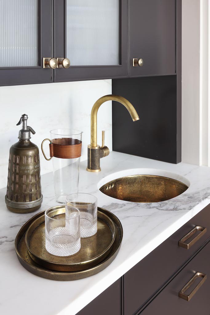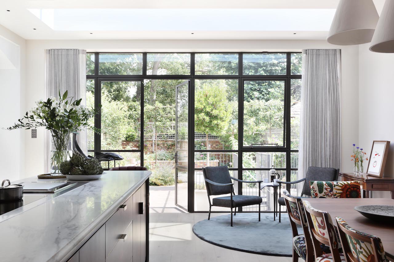 Whilst wishing to limit the palette of materials, we chose to combine blackened steel and antique bronze with hand painted cabinetry and the incorporation of very refined burr walnut on the island.  The result is a timeless design, where cooking and formal entertaining go hand in hand.